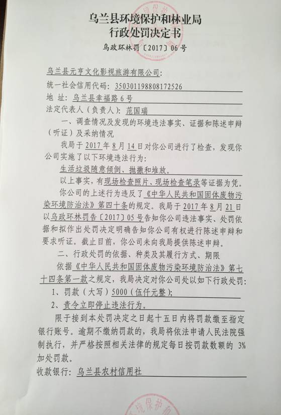 附:《乌兰县环境保护和林业局行政处罚决定书》(乌政环林罚〔2017〕06号)