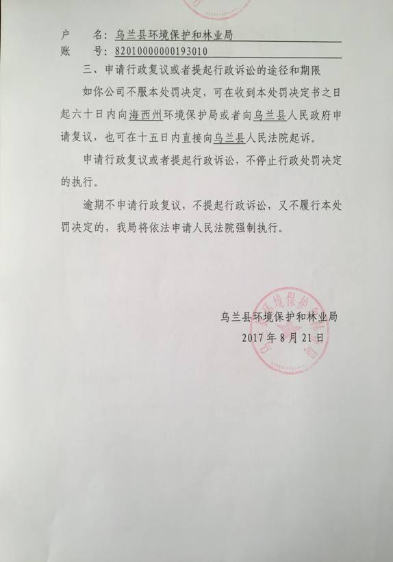 附:《乌兰县环境保护和林业局行政处罚决定书》(乌政环林罚〔2017〕06号)